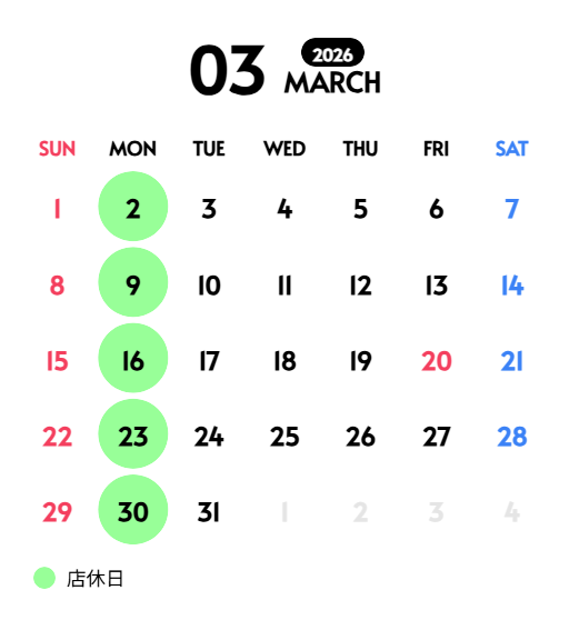 | 店休日 | 月曜日 ※月曜が祝日の場合は翌火曜日 |