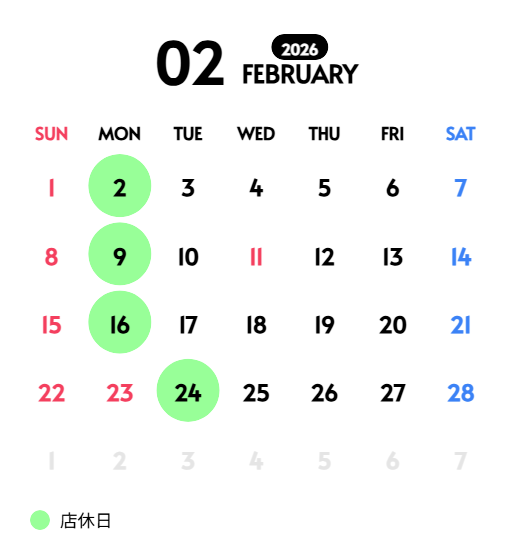 | 店休日 | 月曜日 ※月曜が祝日の場合は翌火曜日 |