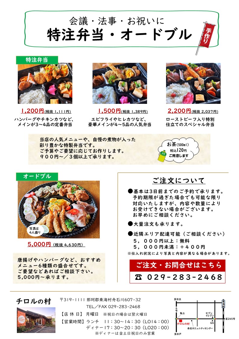 テイクアウト弁当、特注弁当、オードブルのご注文・ご予約はこちら