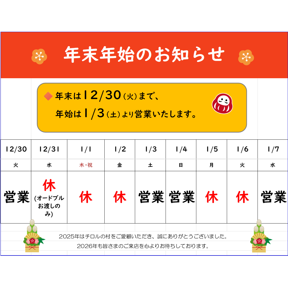 年末年始の営業日のお知らせ 未分類 2025.12.27 年末は 12/30(火) まで、年始は 1/3(土) より営業いたします。 12/31(水) は、オードブルのお渡しのみとなります。 皆さま、どうぞ良いお年をお迎えください。2026年もチロルの村をよろしくお願いいたします。