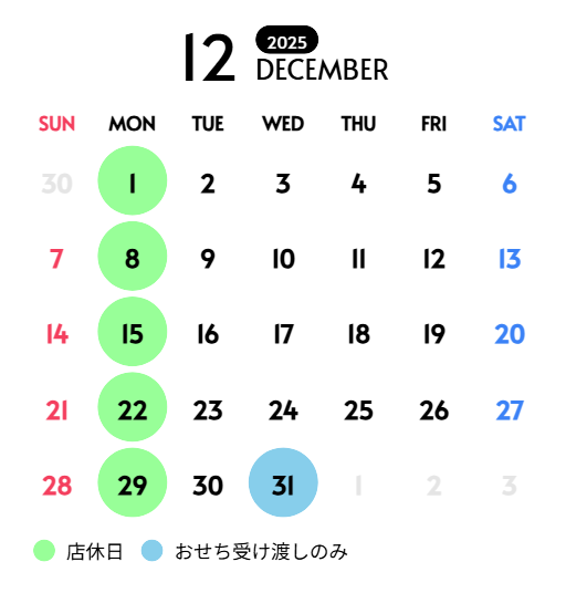 12月営業日のお知らせ 未分類 2025.11.24 12月の営業日のお知らせです。毎週月曜日は店休日となります。12月31日(水)は「おせちオードブルのお渡しのみ」営業とさせていただきます。金・土・日曜日はディナー営業しております。皆さまのご来店を心よりお待ちしております。